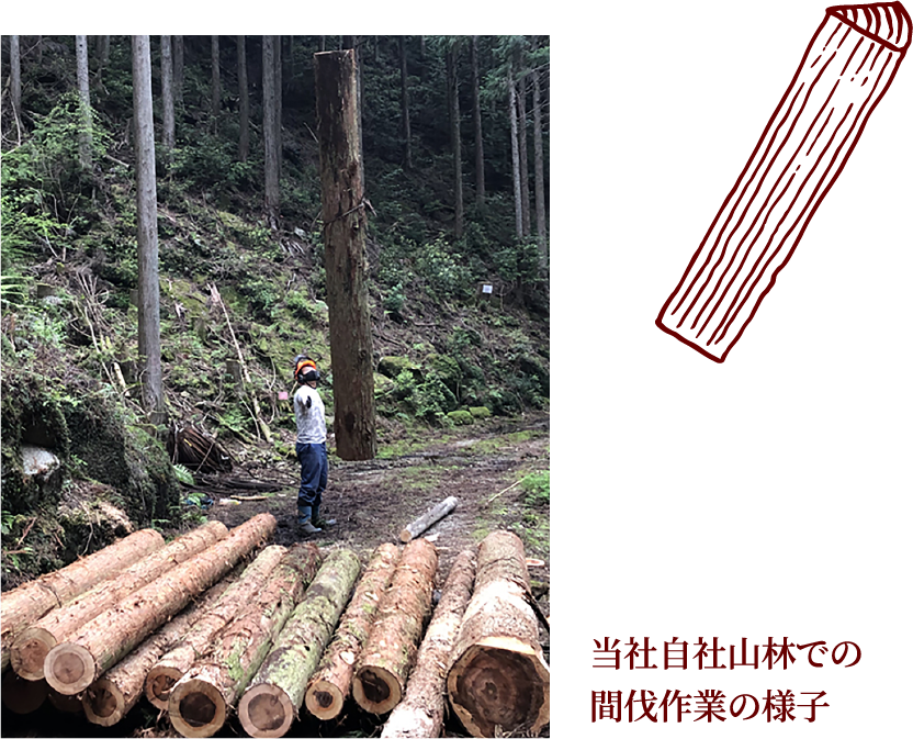 そんな想いから、2021 年より自社山林の間伐材を100%使用した自社フローリング材、構造用集成材の生産に向けた取り組みを始めました。