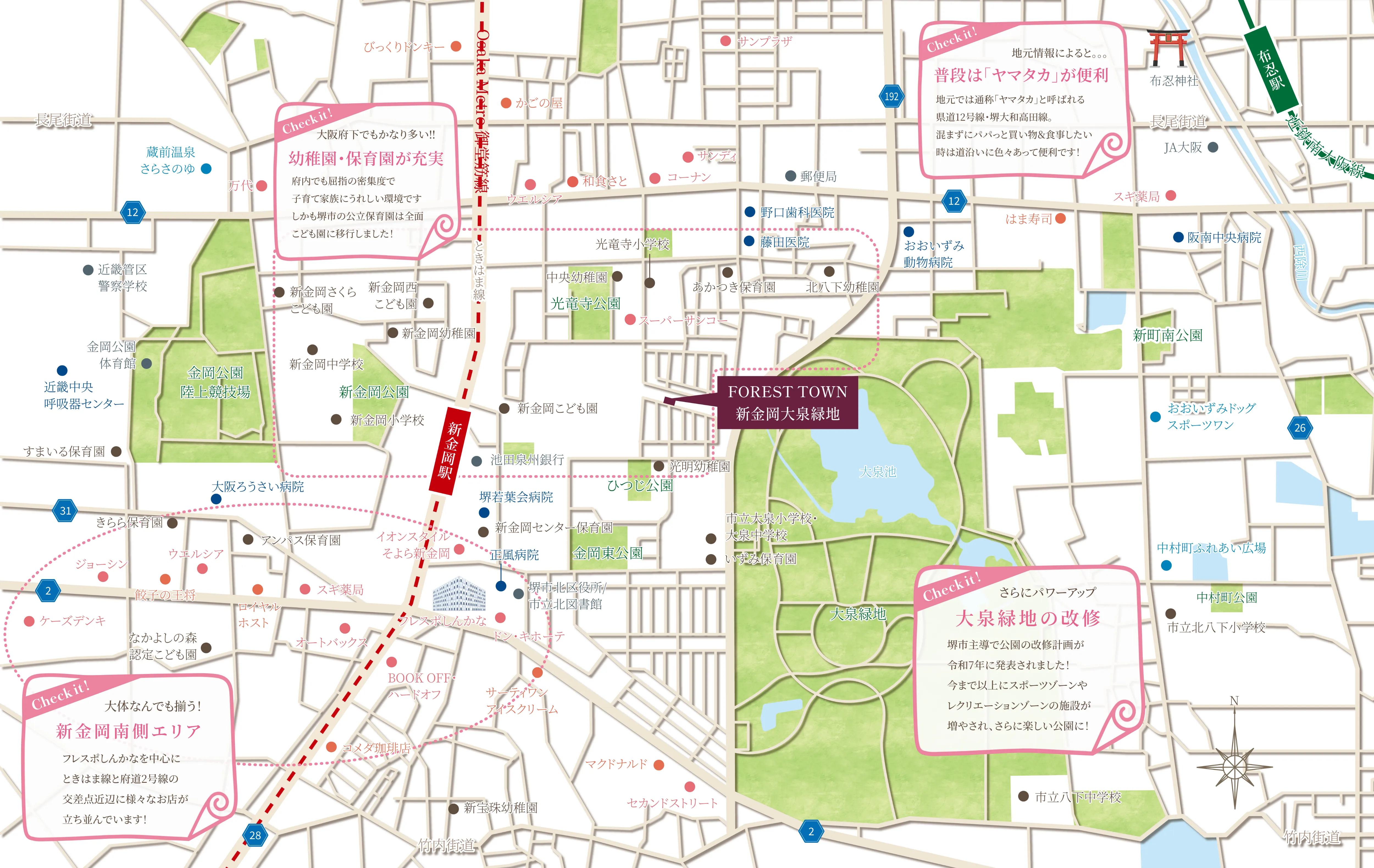駅前にある「フレスポしんかな」「そよら新金岡」がお買い物の中心になっている他、堺市の計画では新金岡2丁府営住宅跡に大型複合施設の建設計画も進行しており、さらに注目が集まるエリアです。